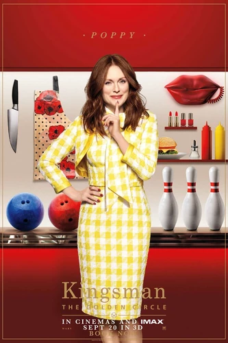 Poppy Adams is the main antagonist of Kingsman: The Golden Circle. She is a notorious criminal mastermind and a global entrepreneur. More accurately, she is the CEO of The Golden Circle, a drug cartel with a monopoly on all major recreational drugs. She plans to dispose of all the Kingsman in order to prevent them from stopping her master plan. She is portrayed by famous actress Julianne Moore.